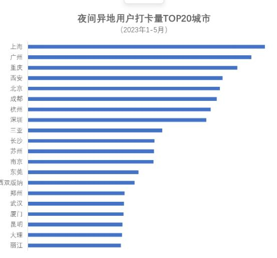 山城夜色迷人,一直深得游客青睐,从异地用户夜间打卡量绝对值看,上海成为外地用户光顾最多的城市,广州、重庆、西安紧随其后。