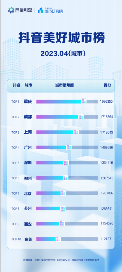 2023年1-5月,抖音用户打卡游玩类别目的地中,重庆位列第一,在城市打卡类别中,游玩倾向在重庆体现的更加强烈,夜游也成为这两座城市重要的名片。
