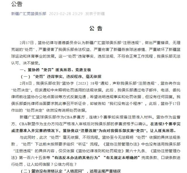对此,新疆广汇男篮不惜以退赛代价,硬刚中国篮协、CBA联盟和篮协主席姚明以及运动员周琦等人。2023年2月底,新疆广汇篮球俱乐部发公告称要: