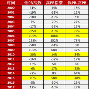 我们用申万低PB指数和高PB指数对年度价值因子进行评估,从2000年以来结果如下表: