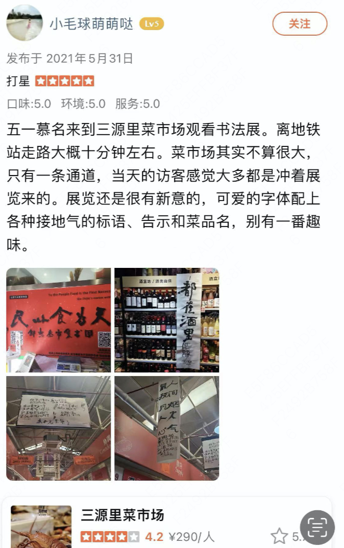 “感觉像菜市场行为艺术,买花的话会有Prada印花包装。”“三源里的书法展,把艺术融入了生活,又本土又俏皮。”“可爱的字体配上接地气的标语、告示和菜名,字的内涵一下子被具象化了。”慕名前来的年轻人,在大众点评上记录下“展览观后感”。