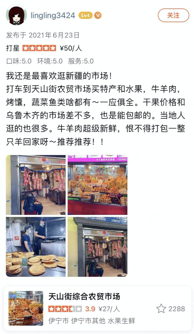 在新疆伊宁,大众点评上天山街综合农贸市场的评价区,芝麻馕、酸奶疙瘩、马肠马肉、各色干果则是内陆游客笔下的“稀罕货”。