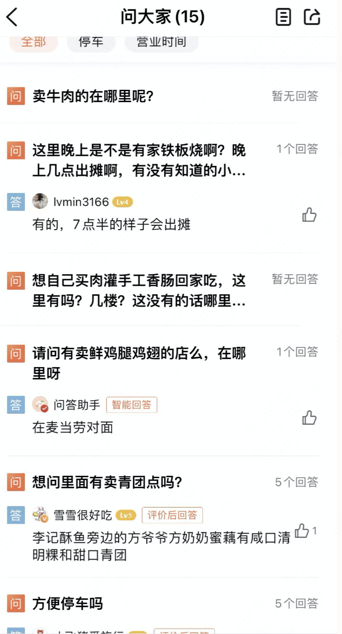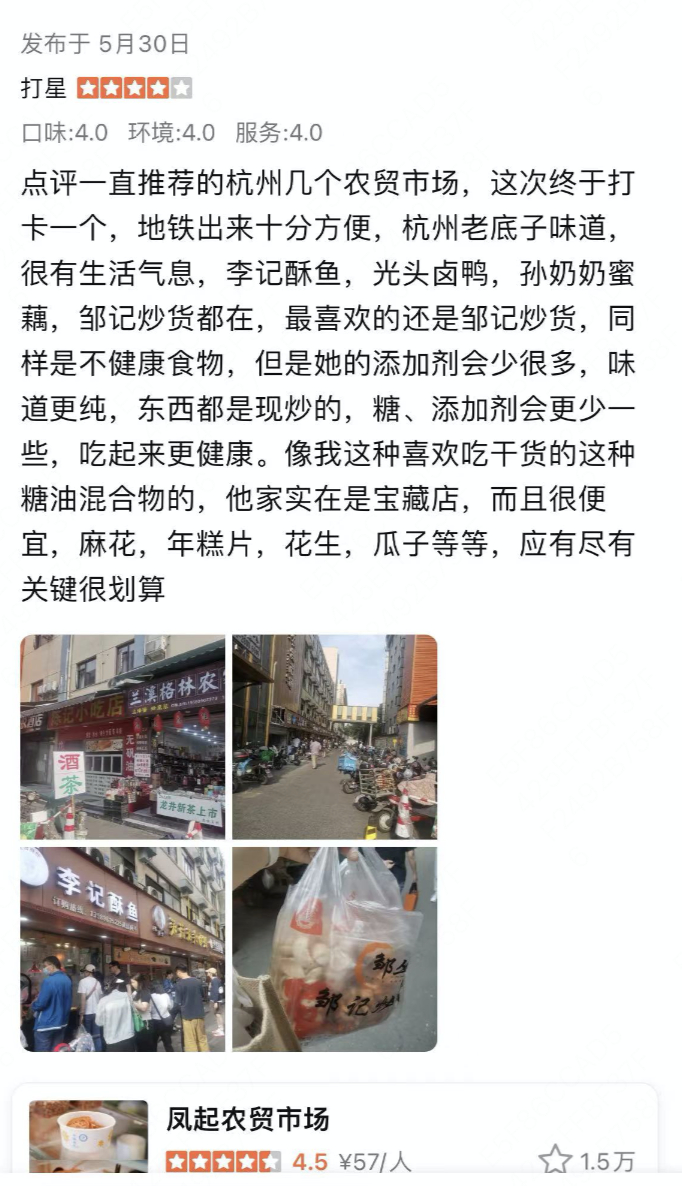 美食测评之外,年轻人甚至把大众点评评价区、问答区和攻略笔记,写成了一份“菜市场导览”。“5号线坐到建国北路,一楼是熟食档口,炒货店和水果店,二楼是肉档、蔬菜档口,以及特色海鲜。”“总体卫生环境好,规划合理布局,产品一目了然。”“酥鱼先称后炸,29块钱大约7、8块,糯米藕一个差不多20块。”以凤起农贸市场的评价区为例,菜场布局、菜品价格、出行路线、营业时间……各类信息事无巨细。
