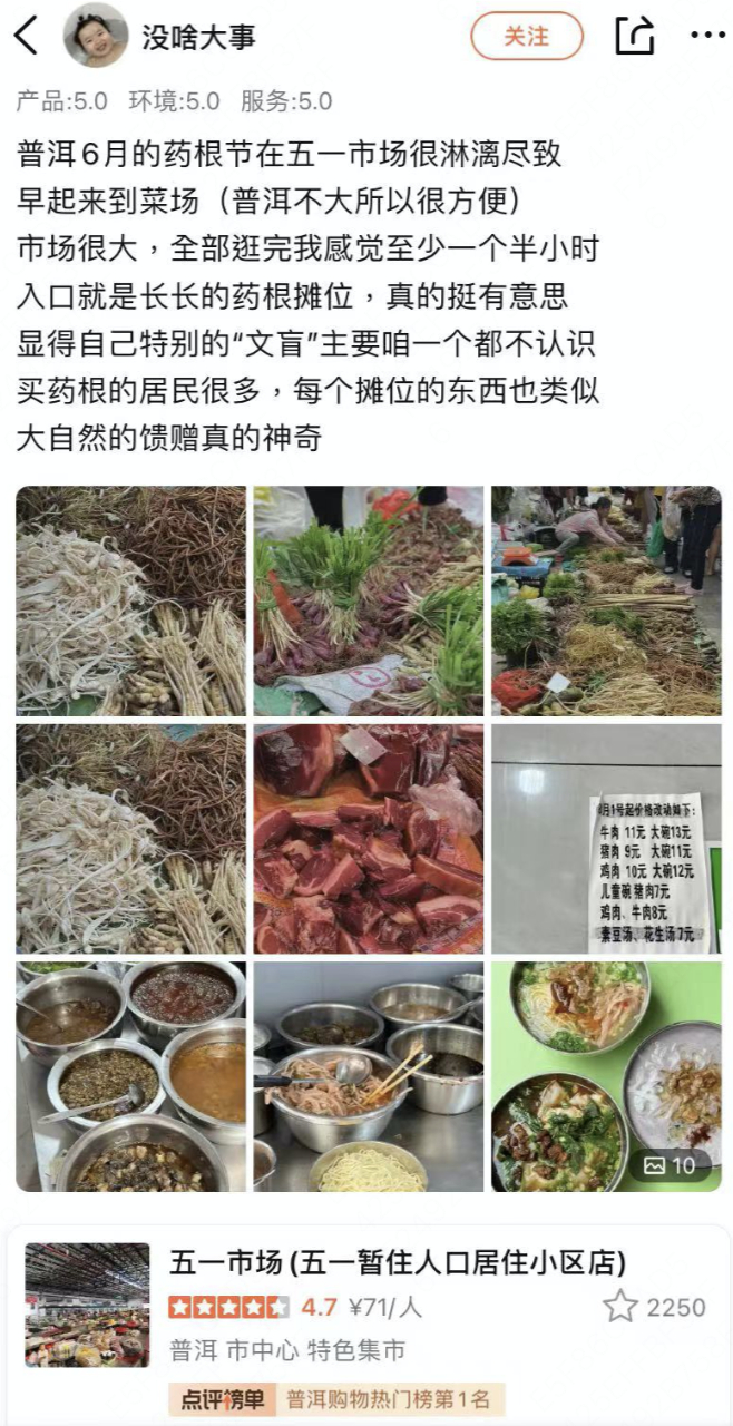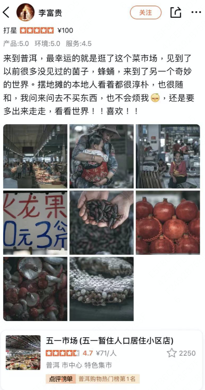 而在新疆、云南等边陲地区,菜市场之于游客来说,更多了一份神秘感。在云南普洱五一市场,药根、蜂蛹、人生果......处处都是年轻人的“知识盲区”。“见到了很多没见过的菌子、蜂蛹,就像来到了另一个奇妙世界。”“巧遇六月普洱药根节,入口就是长长的药根摊位,外地人一个也不认识,到处拉着摊主问。”浏览五一市场的大众点评评价区,仿佛上了一节别开生面的“生物实践课”。