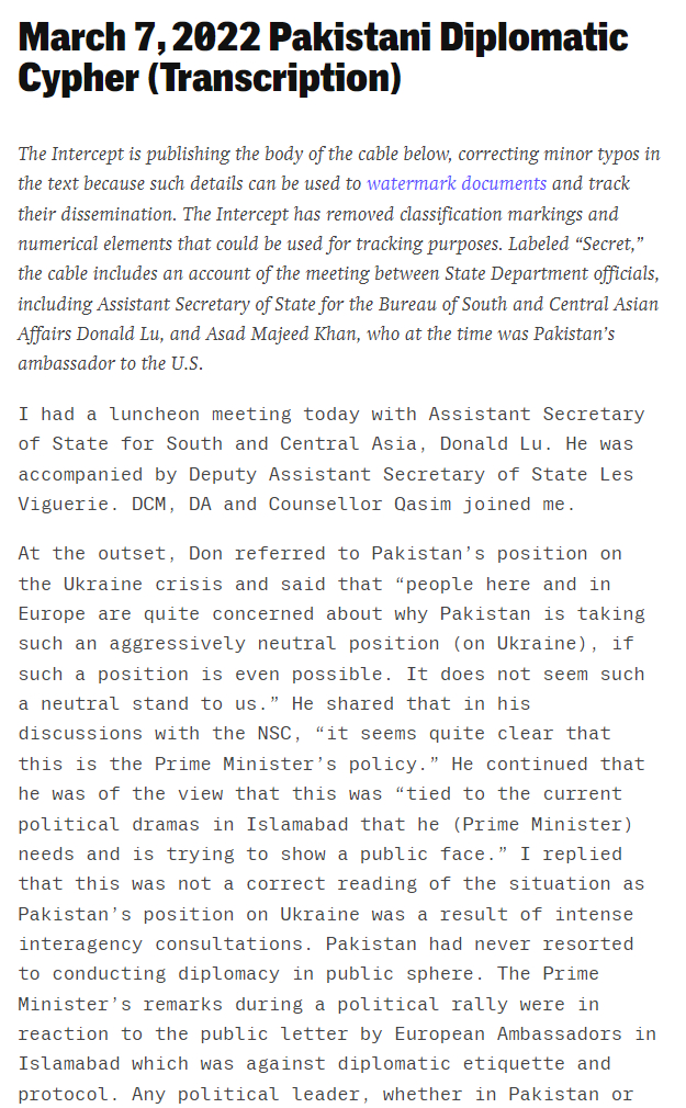 文件记录的会谈发生在2022年3月7日。在当天的会谈中,美国国务院负责南亚和中亚事务的助理国务卿唐纳德·卢和其他官员与时任巴基斯坦驻美大使阿萨德·马吉德·汗进行了交谈。卢代表美国表示,美方对时任巴基斯坦总理伊姆兰·汗在俄乌问题上的中立态度表示不满。耐人寻味的是,美方把伊姆兰·汗的态度称之为“咄咄逼人的中立立场”。