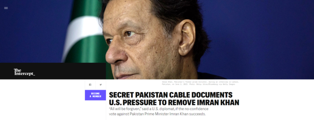 9日,美国调查新闻网站“拦截”(The Intercept)公布了一份巴基斯坦政府的密件。密件显示:美国曾向巴基斯坦施压,要求解除时任总理伊姆兰·汗的职务。