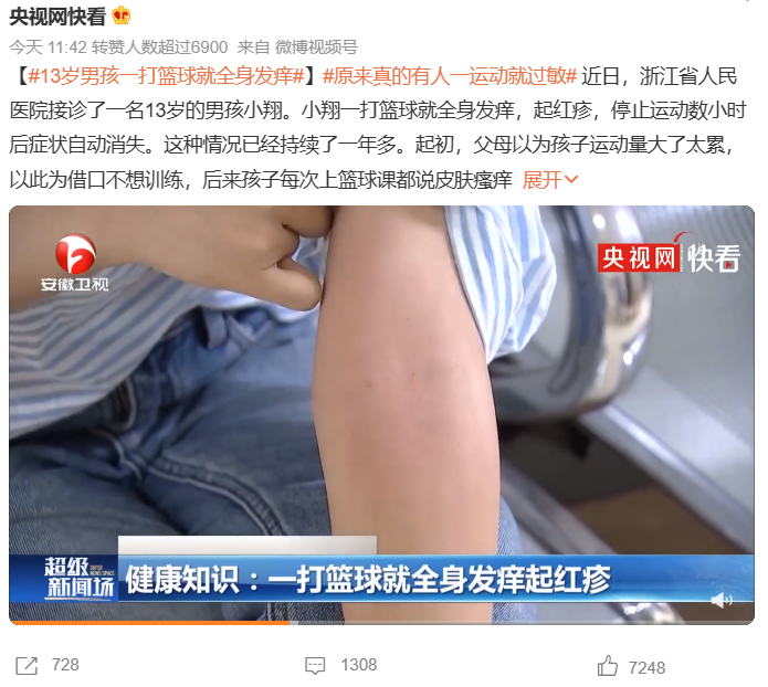 近日,浙江省人民医院接诊了一名13岁的男孩小翔,小翔一打篮球就全身发痒起红疹停止运动数小时后,症状自动消失。