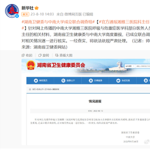 官方通报湘雅三医院科主任被举报:湖南卫健委与中南大学成立联合调查组