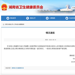 8月10日中午,湖南省卫健委通报:针对网上传播的中南大学湘雅三医院呼吸与危重症医学科部分医务人员举报科主任的相关材料,湖南省卫生健康委与中南大学高度重视,已成立联合调查组,正对相关情况逐一进行核实。一经查实,将依法依规严肃处理。