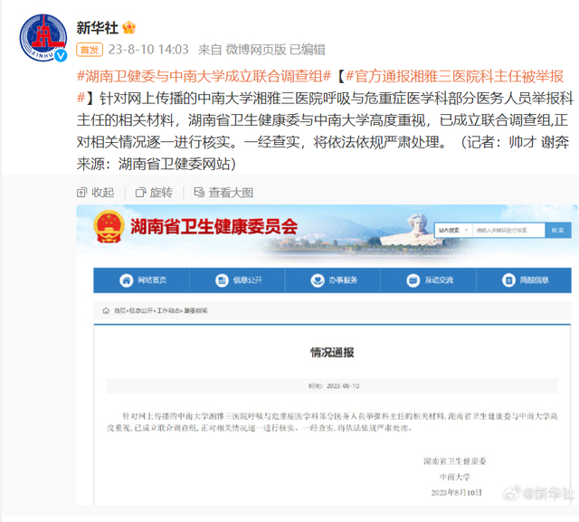 官方通报湘雅三医院科主任被举报:湖南卫健委与中南大学成立联合调查组
