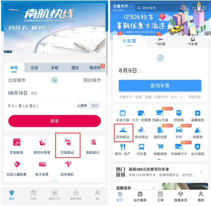 旅客可在双方平台“空铁联运”板块