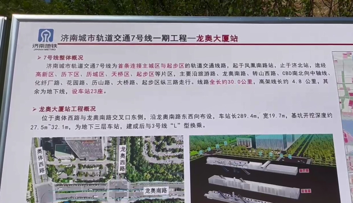 济南城市轨道交通7号线为首条连接主城区与起步区的轨道交通线路,起于凤凰南路站,止于济北站,途经高新区、历下区、历城区、天桥区、起步区等片区。龙奥大厦站(工程名)位于奥体西路与龙奥南路交叉口东侧,沿龙奥南路东西向布设。