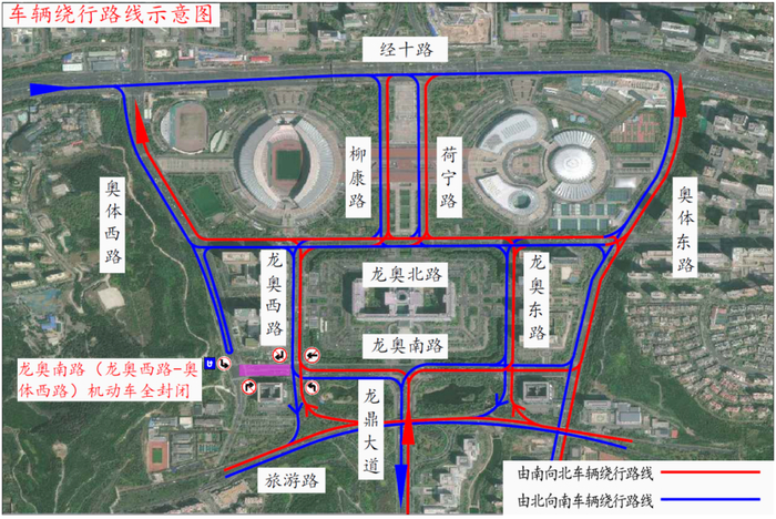 ①通过龙奥南路右转至龙奥西路,再左转至龙奥北路往西行驶;②通过龙鼎大道右转至龙奥南路,再左转至奥体东路往北行驶;③旅游路(龙奥西路匝道下口)直行通过龙奥西路与龙奥南路交叉口后北行,再左转至龙奥北路往西行驶
