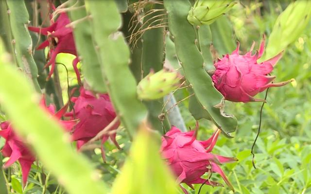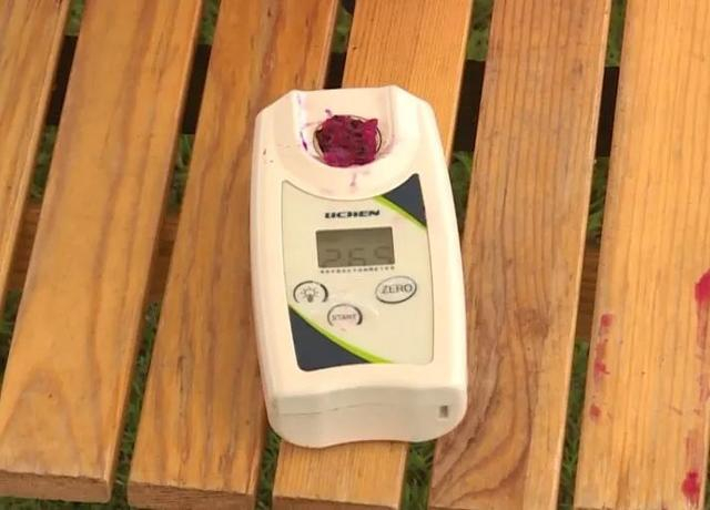 基地种植的是蜜红火龙果,果如其名,果肉红彤彤的,像蜜一样香甜。正因为果肉有一股淡淡的玫瑰清香,又叫“玫瑰火龙果”。和普通的火龙果相比,蜜红火龙果表皮颜色更深,呈深红或暗红色,果形和鳞片更规则,单果重量平均能达到1斤以上,吃起来皮薄多汁,口感香甜,咬上一口,鲜红的汁水四溢,浓郁的果香在口中弥漫开来。蜜红火龙果甜度普遍在24度左右,最高可达到26.5度。