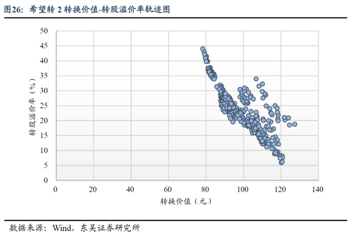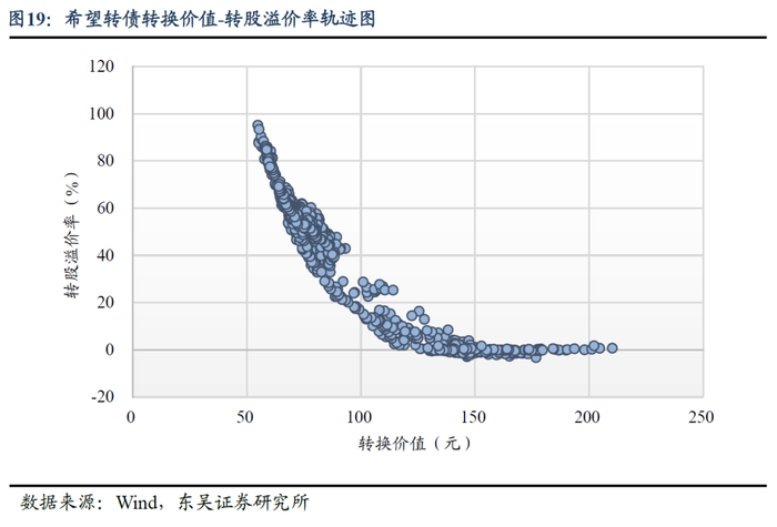 转债价格方面,截至2023年8月1日,巨星转债价格为140.14元,转股溢价率为12.72%,纯债溢价率为59.61%,为“偏股型”标的,弹性为本篇盘点各转债中最高。巨星转债的价格上市前期经历了一次较大起伏,随后长期呈稳健增长。拆分来看,巨星转债上市初平价随正股快速拉升,转股溢价率被动压缩至10%,随后2022.7.13-2022.10.28期间正股股价近乎断崖式下跌,拖累转债;2022年11月至今,正股股价持续上涨,位于上市以来高点,带动转股溢价率下行,转债弹性增强,转债价格稳步上行。从转换价值-转股溢价率散点图来看,希望转债的平价和转股溢价率总体呈常规的凸函数关系,也说明溢价率主要跟随平价变化而被动变化。