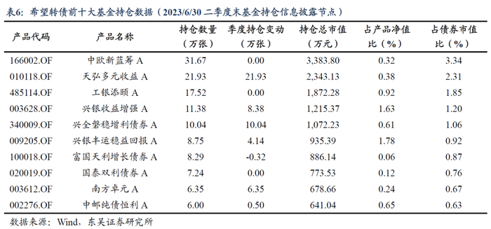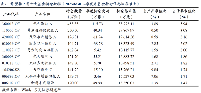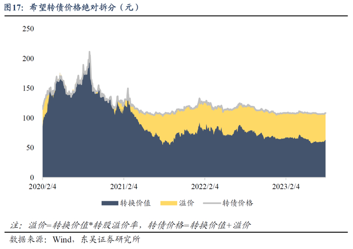 从机构持仓占比情况来看,希望转2关注度更高,市场热度持续。当发行人有多只转债同时存续时,由于其共享正股基本面,市场往往不会将鸡蛋放在同一个篮子里,因而尽管机构持仓希望转2较多,但仍对希望转债有所增持。截至2023Q2,机构持仓希望转债2亿元,较2023Q1环比增长42.86%,占希望转债存续市值的19.76%;持仓希望转2共计37.23亿元,较2023Q1环比略降0.43%,占希望转2存续市值的43.30%,占比较高,因而机构投资者对转债定价或产生较大扰动。