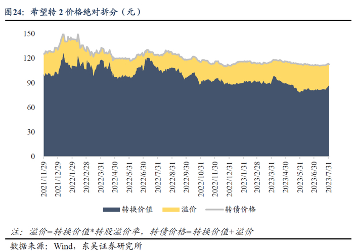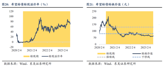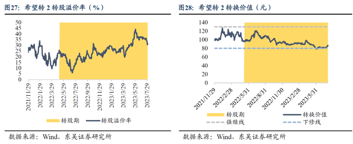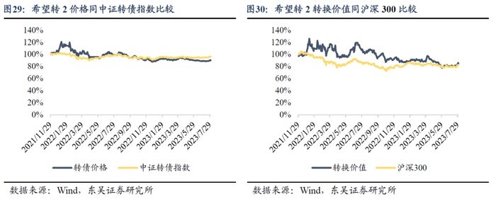 ◼ 希望转债——进攻弹性偏弱,希望转2——攻守兼备:截至2023年8月1日,希望转债价格为108.44元,转股溢价率为72.59%,纯债溢价率为6.22%,为“偏债型”标的,具备较优的债底保护;希望转2价格为112.61元,转股溢价率为31.32%,纯债溢价率为14.50%,为“平衡偏债型”标的,其具备较优的债底保护且同样不乏向上弹性空间。我们判断希望转债存在下修倾向,短期内希望转2暂无下修风险。希望转债和希望转2目前换手率均较低,交投热情偏弱,叠加两者均属于低价债,具有一定配置价值。但两者配置逻辑存在一定分化。