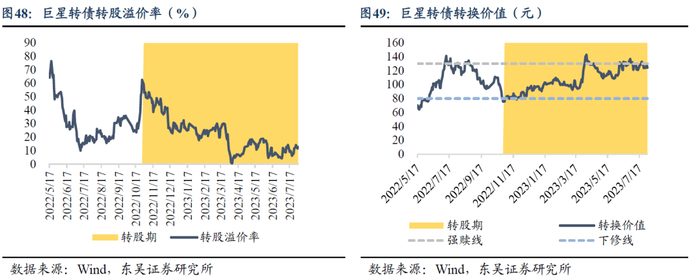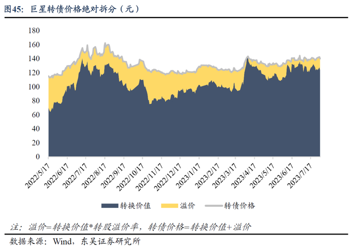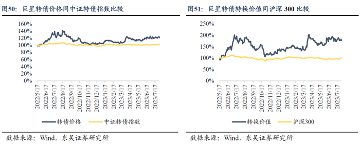 ◼巨星转债——弹性极佳的进攻型标的:截至2023年8月1日,巨星转债价格为140.14元,转股溢价率为12.72%,纯债溢价率为59.61%,为“偏股型”标的,弹性为本篇盘点各转债中最高。我们判断短期内巨星转债强赎风险有限。巨星转债作为“偏股型”标的,股性较强,转债价格变动主要受正股价格驱动,正股价格上涨时转债可获取弹性收益。