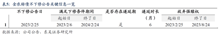 条款博弈方面,近一年金农转债平价总体下行,但5月以来受益于正股股价拉升,平价从下修线下方抬升至接近强赎线。金农转债于2023年2月25日公告不下修,并宣布在未来六个月内(即2023年2月25日至2023年8月24日)均不下修,目前仍属下修递延期,短期内转债价格不受下修因素扰动,条款博弈主要围绕强赎展开。我们判断短期内若触发强赎发行人将实行权利:金农转债存续期仅约半年,未转股比例仍余22.46%,强赎能够加速转股,避免转债到期还款,若错过此次强赎,后续难言仍存机会。