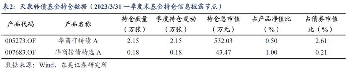 从机构持仓占比情况来看,截至2023Q1,机构持仓天康转债0.06亿元,较2022Q4环比大幅增长99.58%,但仅有两只基金产品仍持有,占天康转债存续市值的2.82%。