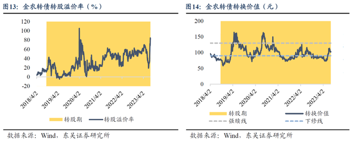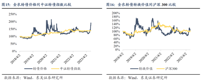 ◼ 金农转债——存续期较短的“双高”标的:截至2023年8月1日,金农转债价格为185.00元,转股溢价率为81.27%,纯债溢价率为86.24%,为“双高”标的,弹性较低且债底保护较弱。我们判断短期内若触发强赎发行人将实行权利。金农转债作为“双高”标的,无法享受正股升值带来的红利,且债底保护较弱,考虑到转债存续期较短,条款风险较大,且交易属性凸显放大了其波动,适合短期持有交易。