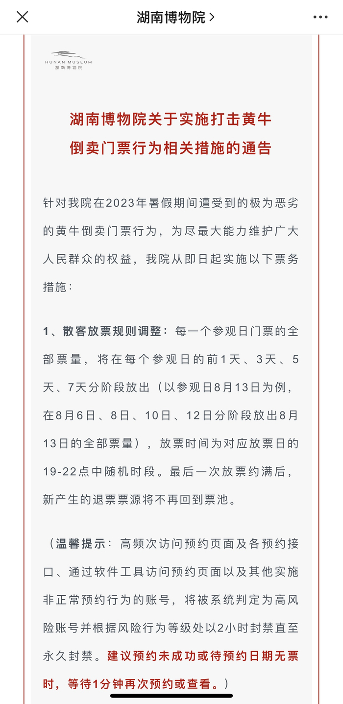 如湖南博物院发布的通告显示,每一个参观日门票的全部票量,将在每个参观日的前1天、3天、5天、7天分阶段放出(以参观日8月13日为例,在8月6日、8日、10日、12日分阶段放出8月13日的全部票量),放票时间为对应放票日的19:00~22:00中随机时段。最后一次放票约满后,新产生的退票票源将不再回到票池。