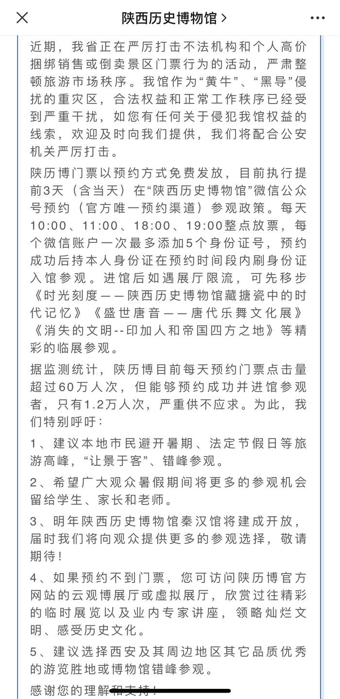 陕西历史博物馆的公告则显示,门票以预约方式免费发放,目前执行提前3天(含当天)在“陕西历史博物馆”微信公众号预约(官方唯一预约渠道)参观政策。每天10:00、11:00、18:00、19:00整点放票,每个微信账户一次最多添加5个身份证号,预约成功后持本人身份证在预约时间段内刷身份证入馆参观。