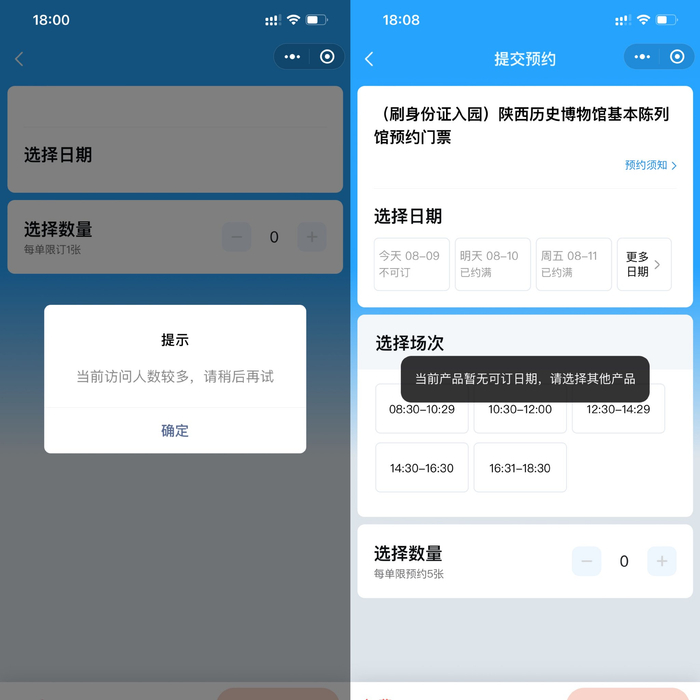 如澎湃新闻在18:00陕西历史博物馆放票的时间“掐点”进入,均出现“当前访问人数较多,请稍后再试”的提示信息,重复刷新预约页面至18:08分不再出现该提示后,又出现“当前产品暂无可订日期”的信息。19:00进入系统也出现同样的情况。
