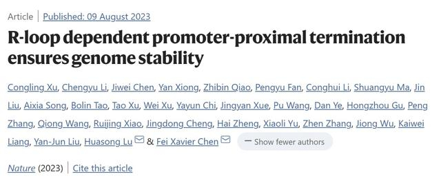 2023年8月9日,复旦大学生物医学研究院/附属肿瘤医院陈飞课题组与浙江大学陆华松课题组合作,在Nature杂志以长文形式发表了文章R-loop dependent promoter-proximal termination ensures genome stability (《R-loop依赖的启动子近端转录早期终止维持基因组稳定性》)。该研究首次发现了INTAC复合物与单链DNA识别复合物SOSS稳定结合并形成SOSS-INTAC复合物;该复合物以凝聚体的形式通过调控细胞内R-loop的水平维持基因组稳定性。