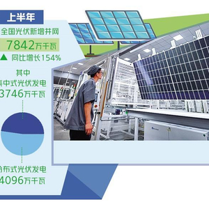 光伏行业继续保持高增长。国家能源局近日发布数据显示,上半年,全国光伏新增并网7842万千瓦,同比增长154%,其中集中式光伏发电3746万千瓦,同比增长234%,分布式光伏发电4096万千瓦,同比增长108%。不仅有效发挥了稳投资、促增长的作用,也为经济社会高质量发展注入动能和活力。