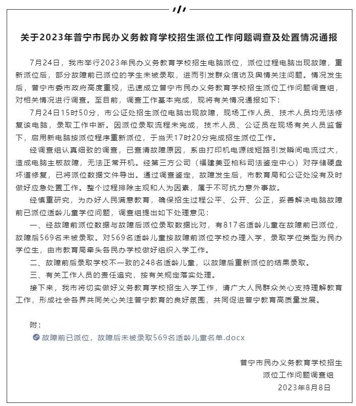 7月24日,普宁市举行2023年民办义务教育学校招生电脑派位,派位过程电脑出现故障,重新派位后,部分故障前已派位的学生未被录取,进而引发群众信访及舆情关注问题。情况发生后,普宁市委市政府高度重视,迅速成立普宁市民办义务教育学校招生派位工作问题调查组,对相关情况进行调查。至目前,调查工作基本完成,现将有关情况通报如下: