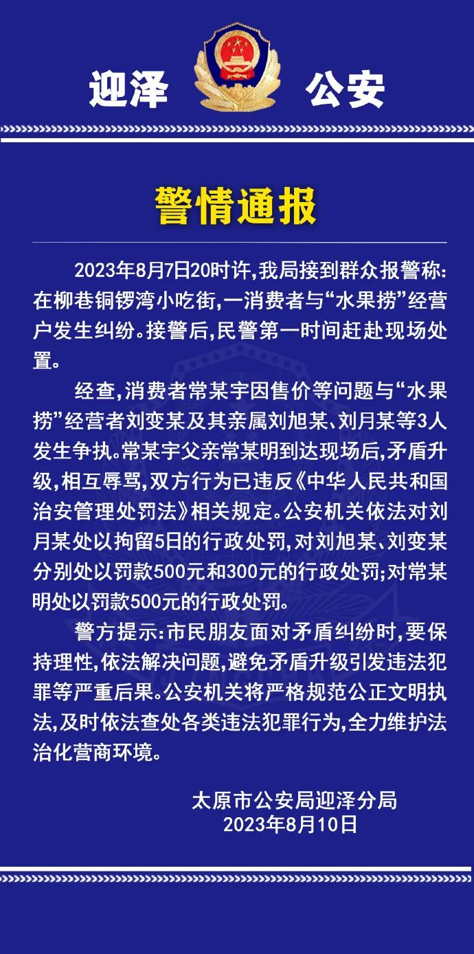 8月7日20时许,太原市公安局迎泽分局接到群众报警称:在柳巷铜锣湾小吃街,一消费者与“水果捞”经营户发生纠纷。接警后,民警第一时间赶赴现场处置。
