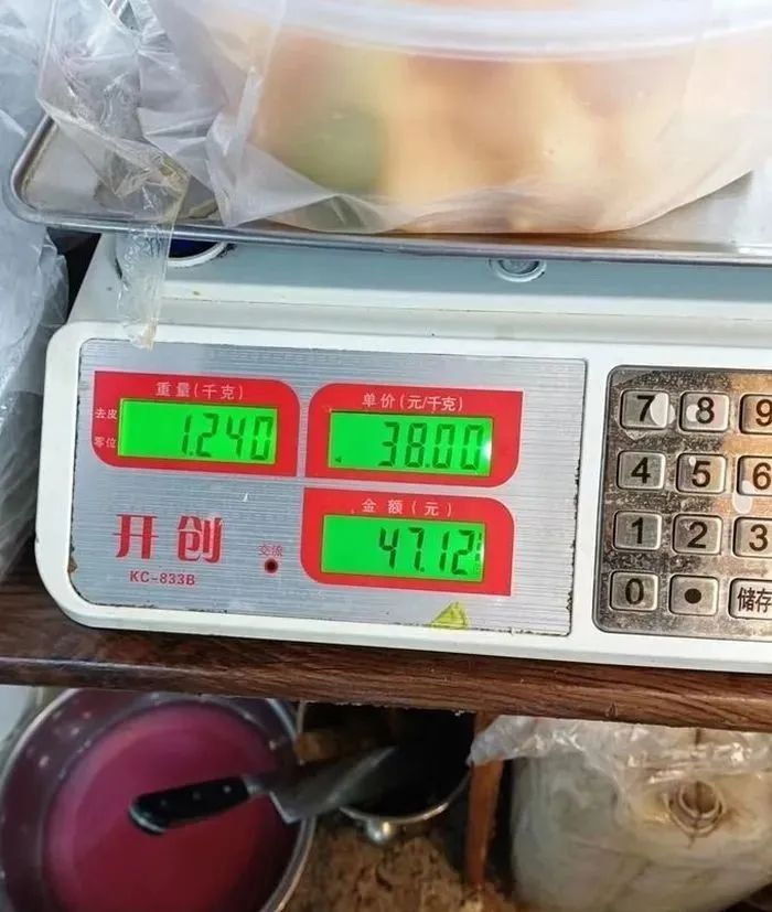 两人选了椰奶,店家加入一勺后称重,随后直接告诉她们共计47元,在常同学的追问下,店家告诉她重量共计两斤半。