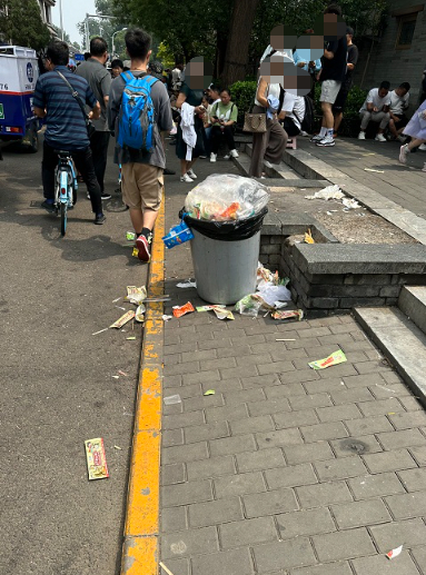 南锣鼓巷,是不少人的进京旅游攻略中,必不可少的一处打卡地。下午3点,正是游客游览高峰。从地铁南锣鼓巷站出站后,自南往北行走,胡同中满是两侧商贩的吆喝声,以及游客的摩肩接踵、欢声笑语。然而记者发现,在胡同多个门店前的地面上、垃圾桶周边、树根周围,都能看到不少生活类垃圾。