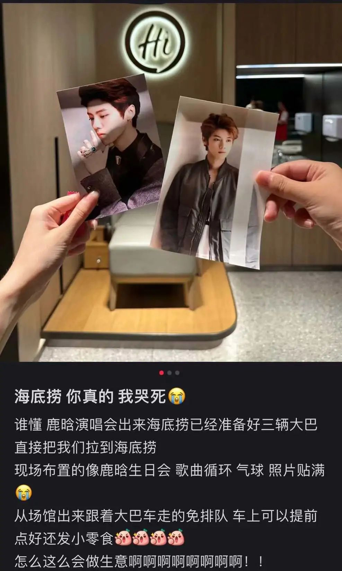 唱到甜头的海底捞从此出没于各大演唱会门口,就像每个等孩子放学的家长,为了刚听完演唱会的金主宝宝们舒坦,海底捞不知道跟韩剧套路学了多少招。