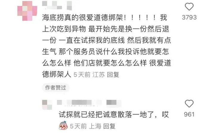 于是消费者跟海底捞的关系产生诡异的局面:你跟海底捞谈钱,海底捞跟你谈感情。某顾客表示自己曾领略过海底捞的道德绑架策略:吃到异物,员工不想被投诉不断试探消费者底线,软磨硬泡打苦情牌。利用“伸手不打笑脸人”原理,成功掩饰食品安全问题。