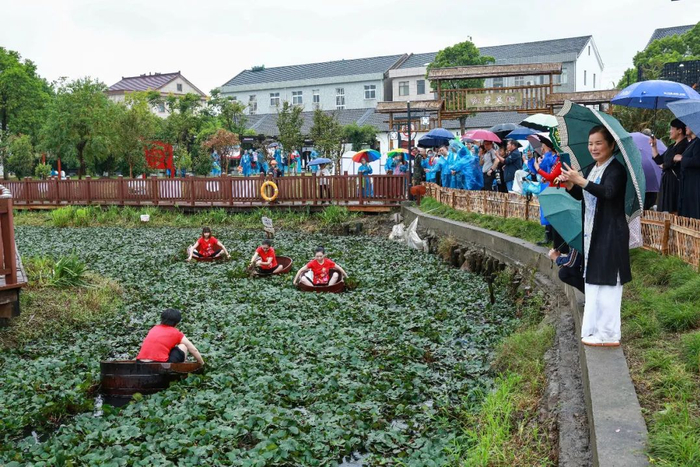 慈溪市胜山镇素有“红菱之乡”的美称,种植红菱已有200多年的历史,种植面积超千亩。红菱共富工坊注册“胜山红”商标,实现以红菱基地为引领、农民合作社和家庭农场跟进、广大小农户参与、利益联结紧密的红菱产业化联合体。如今,红菱基地成为集观光旅游、田园采摘、农事体验于一体的新晋农旅休闲网红打卡地。
