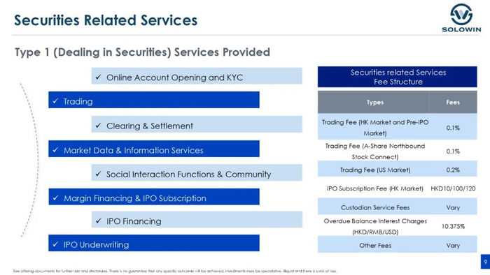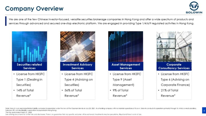 华赢证券,作为香港为数不多的以中国投资者为中心的多功能证券经纪公司之一,主要通过通过其先进和安全的一站式电子平台提供广泛的产品和服务。 目前,华赢证券主要从事向客户提供(i)证券相关服务、(ii)投资顾问服务、及(iii)资产管理服务。华赢证券拥有香港证监会的牌照,包括第1类(证券交易)、第4类(就证券提供咨询)、第6类(就企业融资提供咨询)和第9类(资产管理)。