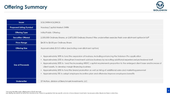 2023年8月8日,来自香港的Solomon JFZ (Asia) Holdings Limited 华赢东方(亚洲)控股有限公司的控股股东Solowin Holdings, Ltd.(以下简称“华赢证券”)在美国证监会(SEC)更新的招股书,拟于美国纳斯达克IPO上市,股票代码SWIN。其于2022年12月23日在SEC秘密递表,后于2023年4月28日在SEC披露招股书。