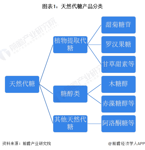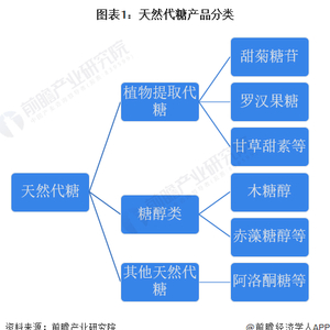 广义上看,天然代糖主要包括植物提取代糖、糖醇类以及其他天然代糖产品。其中植物提取类代糖主要是从甜菊、罗汉果、甘草等植物中提取的甜味剂。糖醇类代糖采用微生物发酵方法制备的,也属于天然代糖。