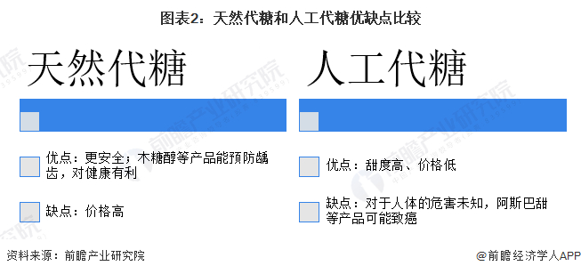 人工代糖和天然代糖相比甜度更高,且价格低廉,在食品饮料工业使用较多。但人工代糖对于人体健康的影响尚不确切,根据现有研究,部分产品例如阿斯巴甜存在致癌的可能性。天然代糖和人工代糖相比安全性更高,木糖醇等产品还能够帮助预防龋齿。