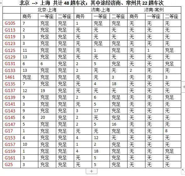 北京到上海,绝大部分车次余票充足,仅个别车次商务座余票较少。