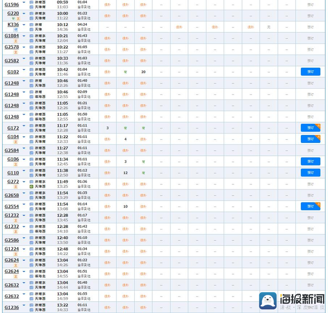 济南去青岛的火车共169趟车次,31趟车次显示没有余票,20趟车次余票较少,只有138趟车次显示可以预订车票。