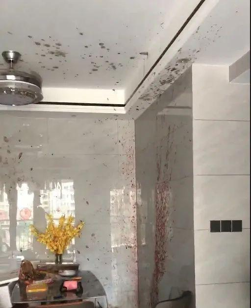 许女士拍摄的视频显示,客厅地板上全是斑斑点点的深红色痕迹,多面墙壁上的深红色痕迹呈放射状,天花板上也有大大小小的斑点状痕迹。