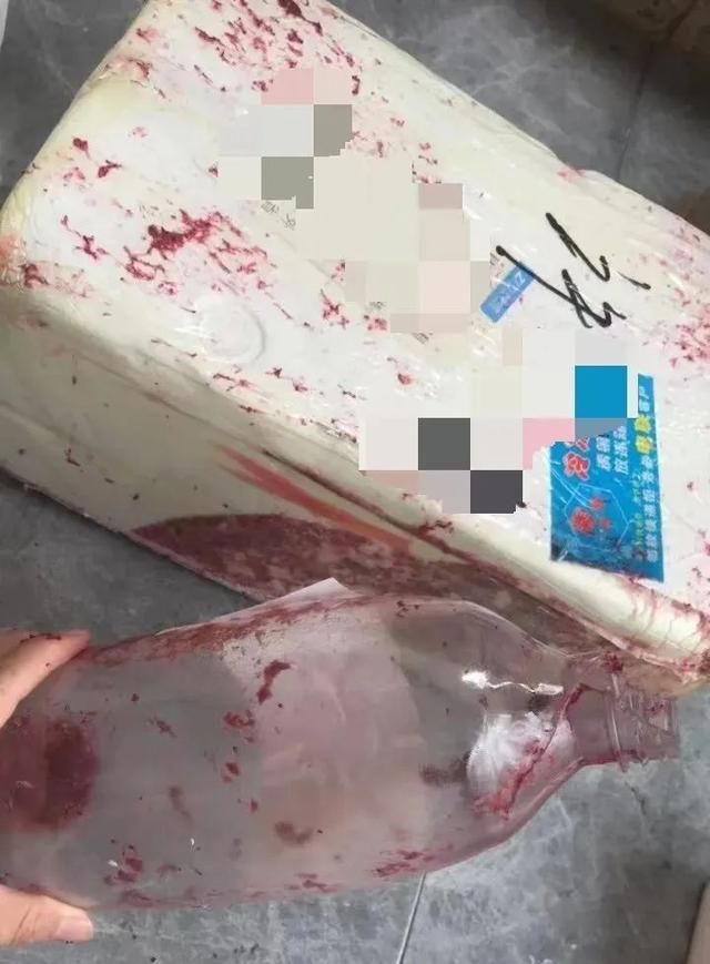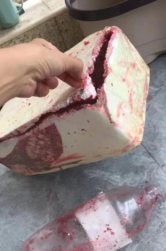 原本装着杨梅浆的白色泡沫箱已经崩裂开,上面有深红色的痕迹,塑料瓶瓶口有破裂和损坏。值得注意的是,白色泡沫箱上有一张蓝色贴纸,上面写有“冷冻食品,请第一时间放冰箱冷冻”。