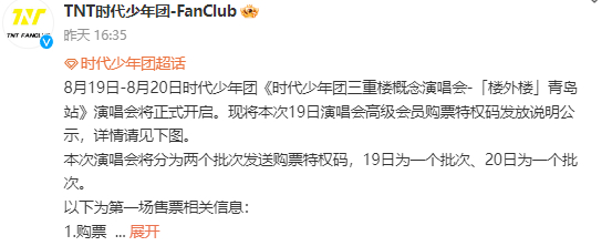 今(11)日,时代少年团粉丝站官微在下午17时发博,称《时代少年团三重楼概念演唱会「楼外楼」青岛站》因故暂缓开票,具体开票时间待定。