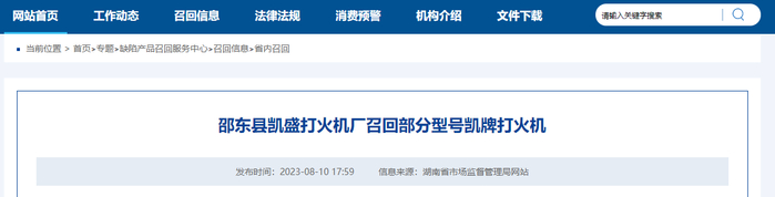 中国质量新闻网讯 据湖南省市场监督管理局缺陷产品召回服务中心网站2023年8月10日消息,日前,邵东县凯盛打火机厂按照《消费品召回管理暂行规定》的要求,主动向湖南省市场监督管理局报告了召回计划,将自即日起,召回2022年10月期间制造的凯牌920型号半包中华打火机,涉及数量为40850支。