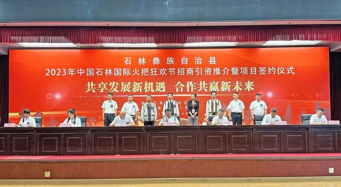 8月10日下午,石林县行政中心报告厅座无虚席,2023中国石林国际火把狂欢节招商引资推介暨项目签约仪式在此举行。