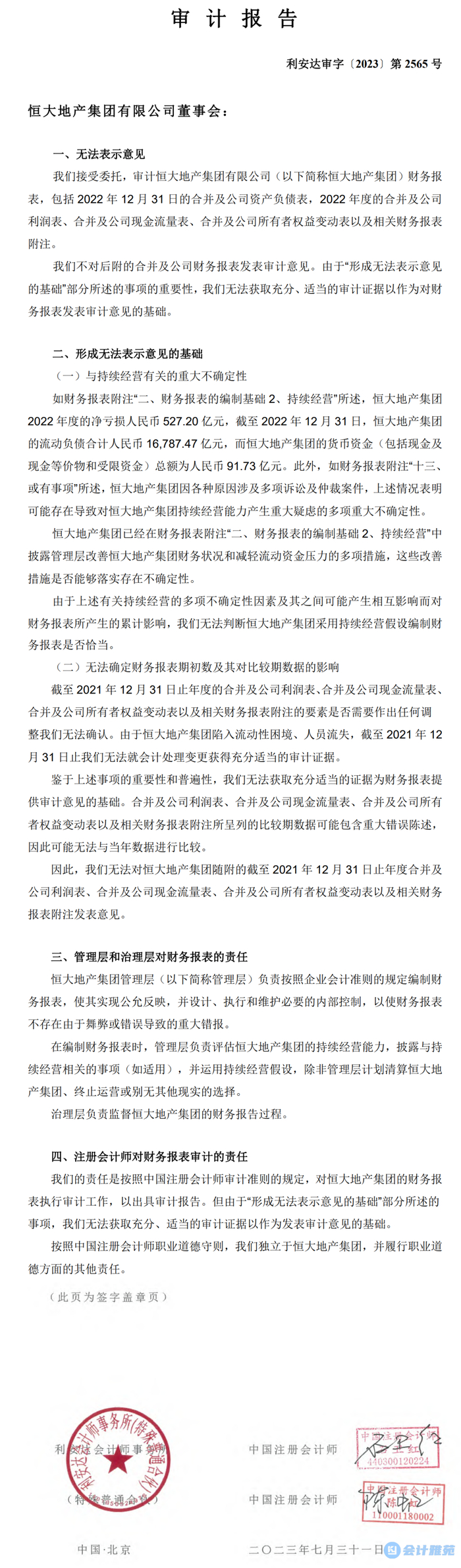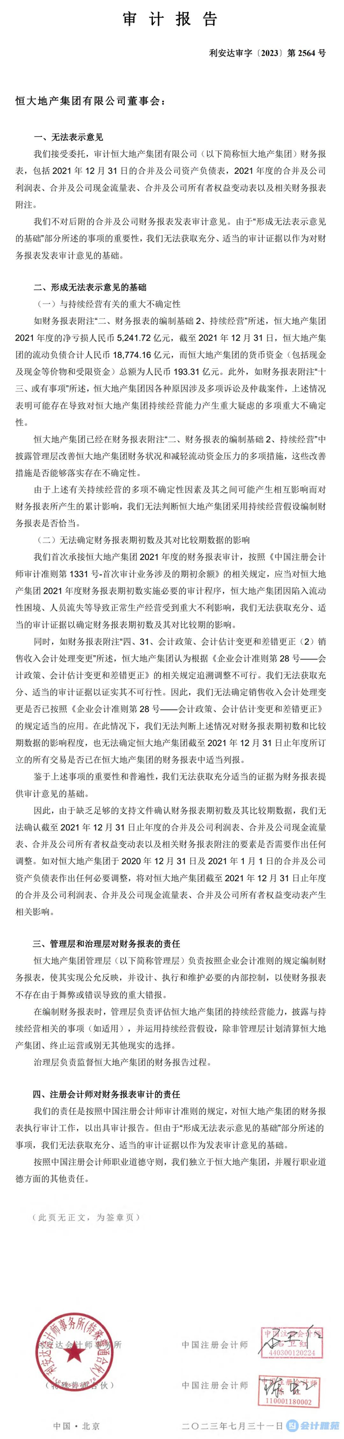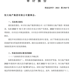 恒大地产公布2021、2022年度审计报告!利安达会计师事务所发表无法表示意见!