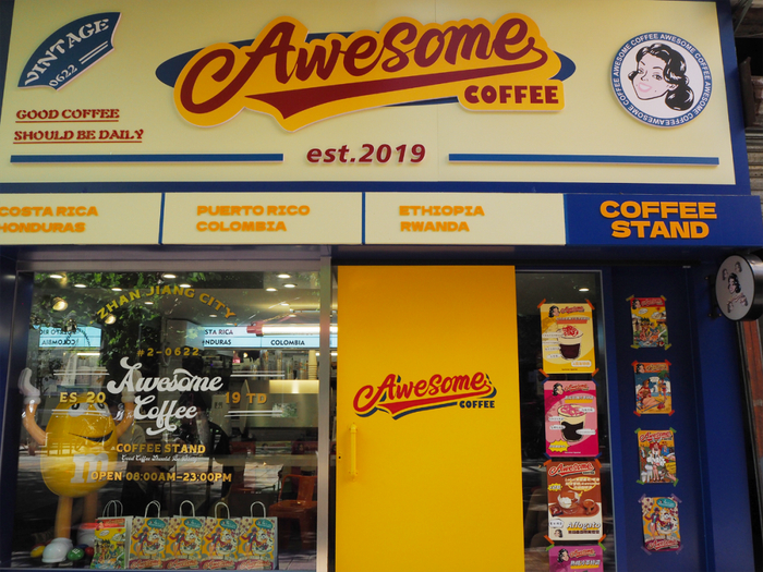 来自湛江的小众咖啡品牌AWESOME COFFEE,主打美式复古风格。湛江的门店由不足8平米的单车库改造而来,全黑设计,潮酷有范;六运小区的广州首店采用黄蓝撞色,高饱和度设计让人眼前一亮。产品主打以咖啡为主的创意特色饮品,不定期更新产品以保持新鲜感。